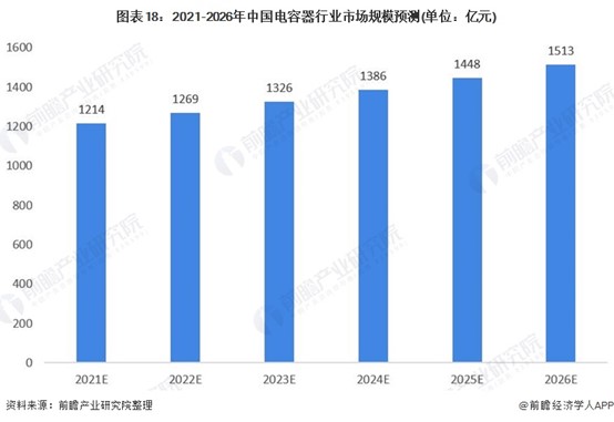 隨著下游5G通訊行業、新能源汽車行業、消費電子業的技術升級,電容器的應用領域將不斷拓寬,需求量越來越大。因此,電容器具有廣闊的發展空間。前瞻保守估計,2021-2026年電容器行業市場規模將以4.5%左右的增速增長,2021年電容器行業市場規模預測為1214億元,2026年電容器行業市場規模預測為1513億元。