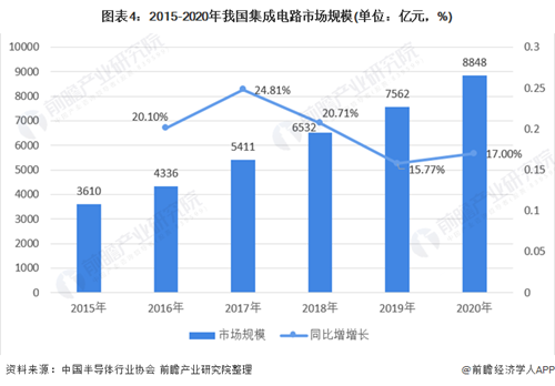 圖表4:2015-2020年我國集成電路市場規模(單位:億元,%)