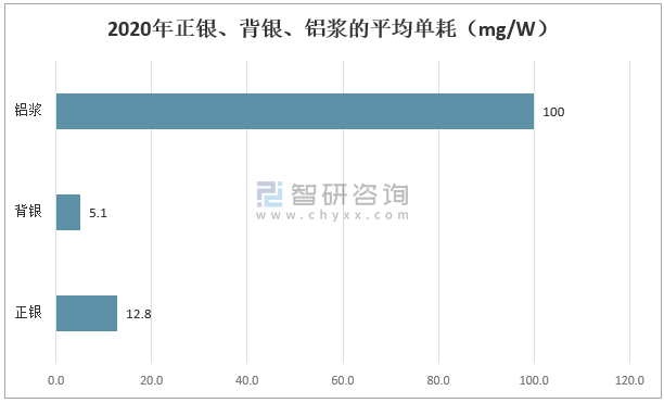 受益于硅片尺寸增大、電池轉換效率快速提高以及印刷技術的進步,2020年中國正銀、背銀、鋁漿的平均單耗分別為12.8mg/W5.1mg/W100mg/W,整體降幅明顯。