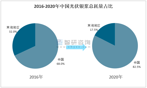 數據顯示:中國光伏銀漿總耗量占全球比重不斷提升,2016年占比為68.0%2020年占比達到82.5%,提升了14.5個百分點。