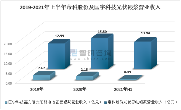 2020年帝科股份光伏導電銀漿營業收入為15.80億元,匡宇科技高方阻太陽能電池正面銀漿營業收入為2.18億元。2021年上半年帝科股份光伏導電銀漿營業收入為13.94億元,匡宇科技高方阻太陽能電池正面銀漿營業收入為0.49億元。