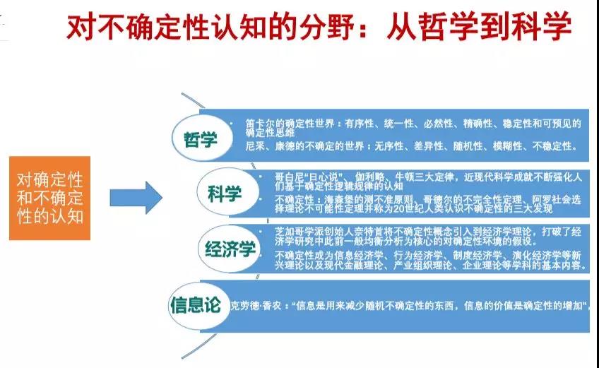 化解不確定性的“三部曲”。第一,理解和認知世界運行的規(guī)律,是化解不確定性的邏輯起點;第二,理解運行規(guī)律之后需要預測將會發(fā)生什么,這是決策的基礎和依據(jù);第三是控制,是將決策付諸行動的具體路徑。