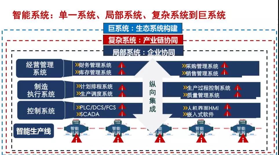 德國工業(yè)4.0講橫向集成、縱向集成、端到端集成,從這個角度來講,什么是集成?集成是數(shù)據(jù)的互聯(lián)互聯(lián)網(wǎng)互操作,集成的本質就是對制造資源優(yōu)化范圍、領域深度的描述,從自動化到智能化,就是從局部優(yōu)化到全局優(yōu)化的過程,在時間上優(yōu)化只有起點沒有終點,空間上參與優(yōu)化的資源從點、線、面、大系統(tǒng)、巨系統(tǒng)的方向不斷地擴展。如果說,自動化是單點的、低水平的,有限的資源優(yōu)化;那么,智能化是多點、高水平、全局的資源優(yōu)化。所謂集成的過程,就是對制造過程的范圍領域不斷地深化的過程。