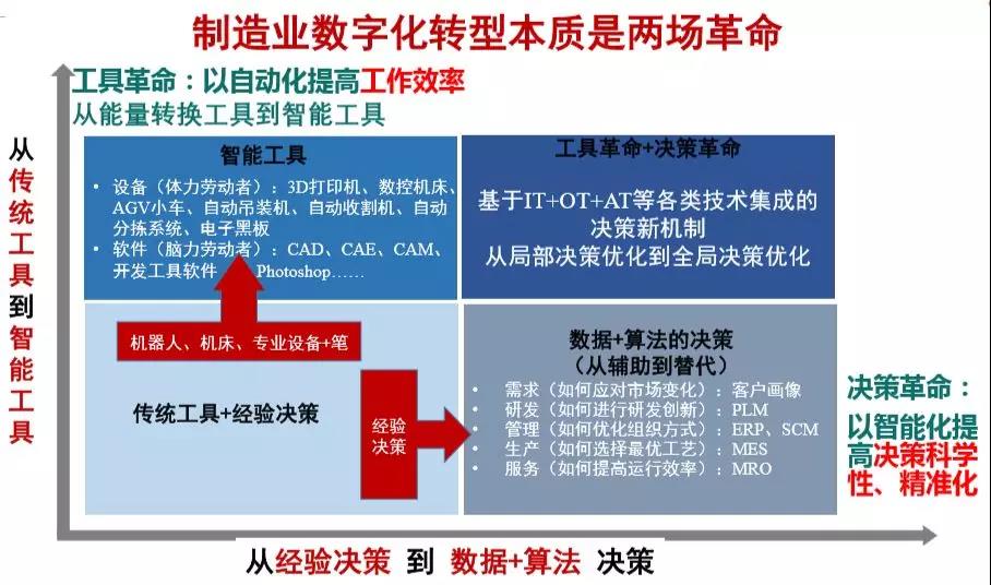我們可以從這兩個維度上觀察和理解企業(yè)的數(shù)字化轉型。從工具革命的維度看,自動化的工具提高了體力勞動者和腦力勞動者的效率,傳統(tǒng)的機器人、機床、專業(yè)設備等傳統(tǒng)工具正升級為3D打印、數(shù)控機床、自動吊裝設備、自動分檢系統(tǒng)等智能工具,傳統(tǒng)能量轉換工具正在向智能工具演變,大幅提高了體力勞動者效率;同時CAD、CAE、CAM等軟件工具提高了腦力勞動者的工具效率。從決策革命的維度看,企業(yè)內部 EPR、CRM、SCM、MES等通用軟件和自研軟件系統(tǒng),通過不斷挖掘、匯聚、分析消費者以及研發(fā)、生產、供應鏈等數(shù)據(jù),基于數(shù)據(jù)+算法構建一套新的決策機制,替代傳統(tǒng)的經驗決策,實現(xiàn)更加高效、科學、精準、及時的決策,以適應需求的快速變化。