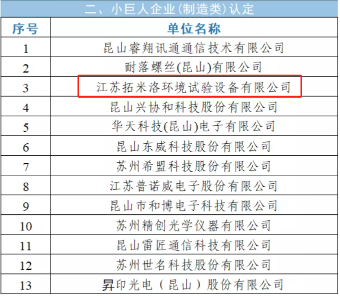 近日,江蘇省工信廳公布2021年度省專精特新小巨人擬認定企業名單和復核擬通過企業名單,江蘇拓米洛環境試驗設備有限公司獲得了小巨人企業(制造業)的認定。