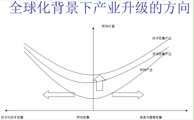 這條三條線代表不同的產業,最低的是傳統產業,往上是資本密集產業、技術密集產業。在同等價格環節上,它們都會有一個升級的過程。縱向是傳統產業升級,叫產業間的升級。因為有了全球價值鏈,一個國家的升級有了兩個新的方向,在微笑曲線向兩端升級,就是從低附加價值環節向上游研發和復雜零部件生產升級,以及向下游去做服務、做品牌。在新的全球化背景下,一個國家的升級有了三個方向,既有傳統的產業間升級,同時又有了價值鏈的升級。這是我們討論全球價值鏈帶來的一個很重要的新思路。