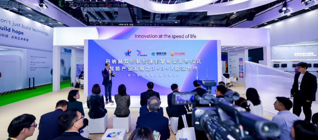 圖片▲第六屆進博會之際,丹納赫就“1+3+X”產(chǎn)業(yè)創(chuàng)新轉(zhuǎn)化加速器分別與商務(wù)部投資促進局、植恩生物、火石創(chuàng)造宣布合作
