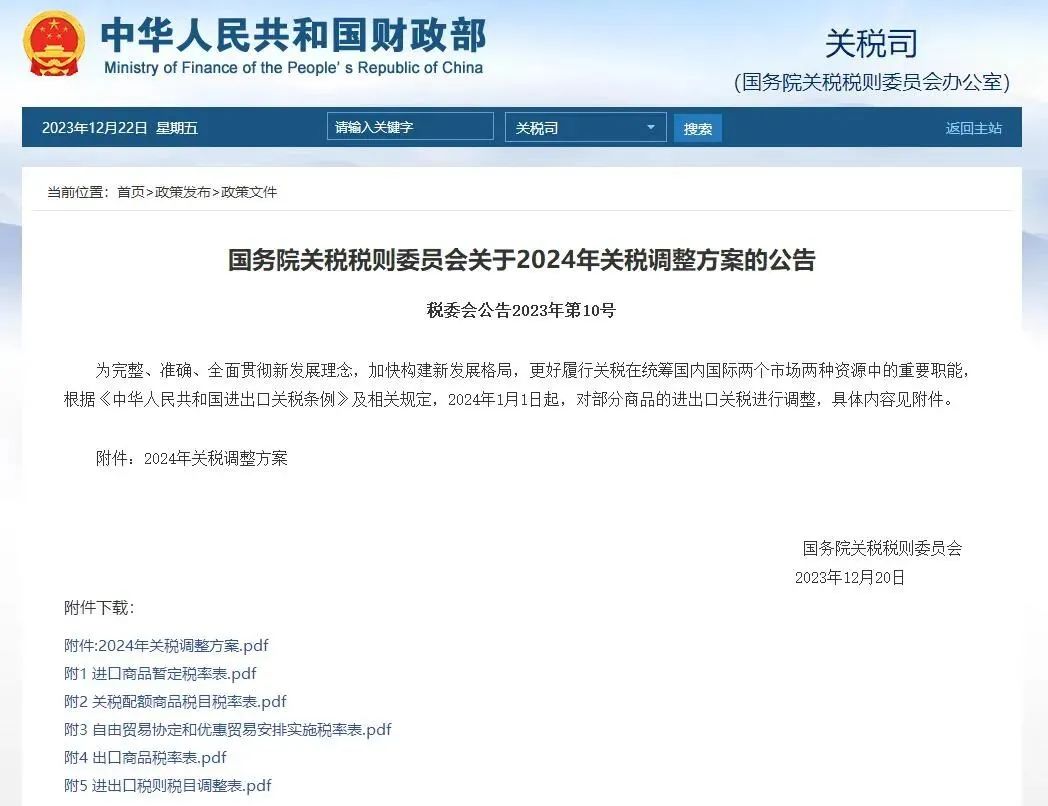 12月21日,國務院關稅稅則委員會發(fā)布2024年關稅調(diào)整方案公告。為完整、準確、全面貫徹新發(fā)展理念,加快構建新發(fā)展格局,更好履行關稅在統(tǒng)籌國內(nèi)國際兩個市場兩種資源中的重要職能,根據(jù)《中華人民共和國進出口關稅條例》及相關規(guī)定,2024年1月1日起,對部分商品的進出口關稅進行調(diào)整。