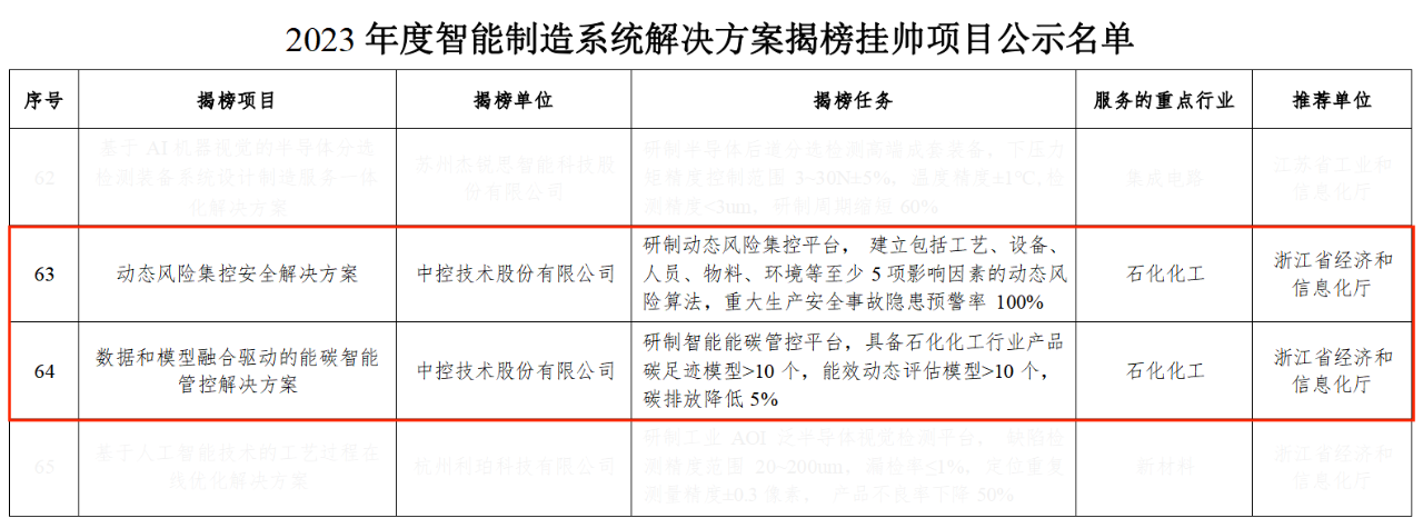 近日,中控技術(shù)股份有限公司(以下簡稱“中控技術(shù)”)的“動態(tài)風險集控安全解決方案”和“數(shù)據(jù)和模型融合驅(qū)動的能碳智能管控解決方案”成功入選國家工信部公示的“2023年度智能制造系統(tǒng)解決方案揭榜掛帥項目名單”。