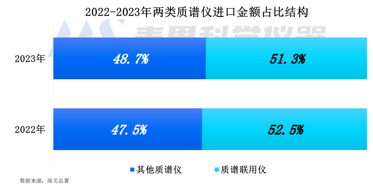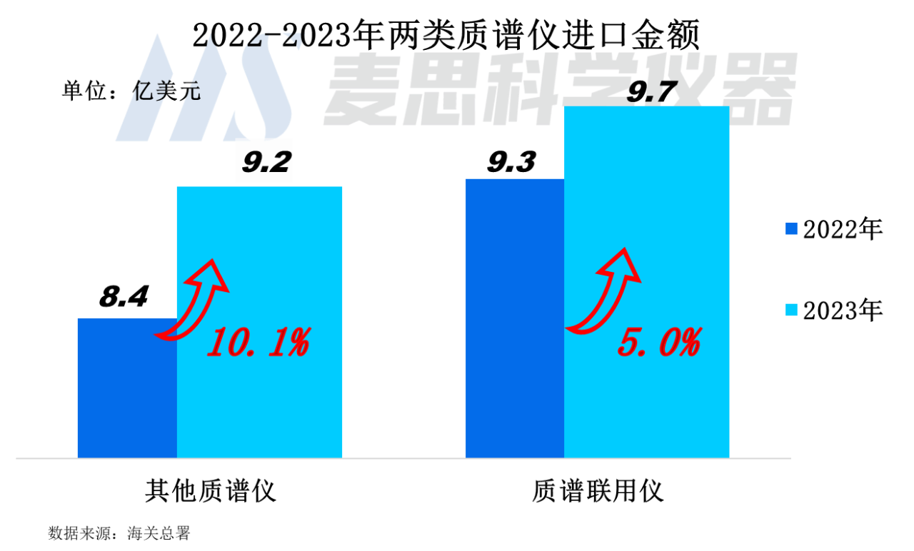 2023年其他質譜儀的進口金額為9.2億美元,較2022年同比增長了10.1%。質譜聯用儀進口金額達9.7億美元,較2022年增長5.0%。兩類質譜儀進口規模均呈現正增長。