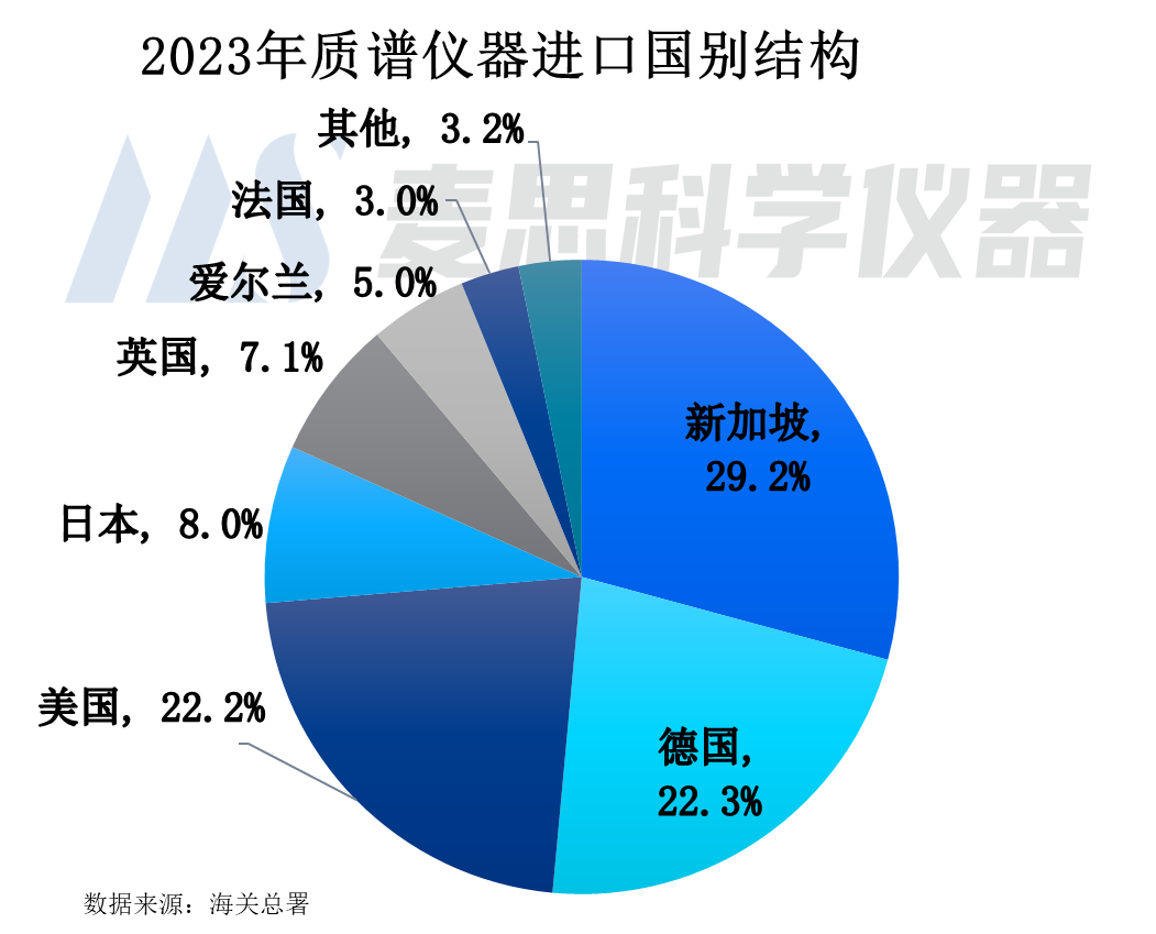 從2023年質譜儀器進口國別結構看,排名前五位為新加坡、德國、美國、日本以及英國,進口金額占比分別為29.2%、22.3%、22.2%、8.0%以及7.1%。