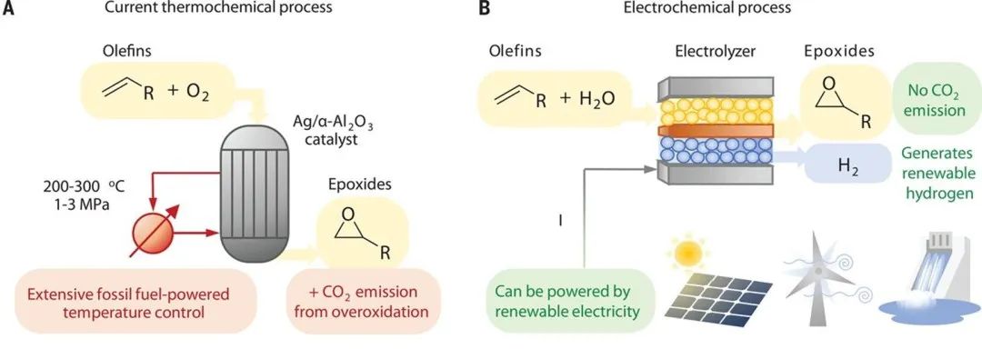 加拿大多倫多大學Edward H. Sargent院士課題組采用電化學合成法,借助氧化還原介質氯離子,在常溫常壓下達成電極和乙烯之間的電子交換,將乙烯成功轉化為環氧乙烷和環氧丙烷(圖B)。相對于傳統熱合成環氧乙烷/環氧丙烷的嚴苛條件,如高溫高壓(200-300°C1~3Mpa),Ag催化乙烯完成環氧乙烷的合成(圖A),且生產1噸的環氧乙烷就會同時排放0.9噸的CO2, 文中采用綠色電化學方法實現了零碳排、更溫和和更具選擇性的環氧乙烷/環氧丙烷的合成,有望代替苛刻的熱合成法,實現工業化,文章發表在Science[2]