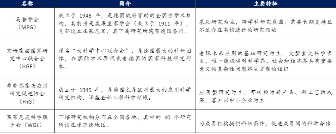 除弗勞恩霍夫協(xié)會(huì)外,德國還有馬普學(xué)會(huì)、亥姆霍茲國家研究中心聯(lián)合會(huì)和萊布尼茨科學(xué)聯(lián)合會(huì)三大國家科研組織,分別在基礎(chǔ)研究、未來應(yīng)用研究、促進(jìn)研究機(jī)構(gòu)間的科學(xué)溝通等領(lǐng)域發(fā)揮作用。四大骨干科研組織為戰(zhàn)后德國工業(yè)的發(fā)展起到了重要的支撐作用。
