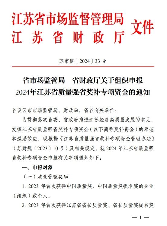 江蘇省市場監(jiān)管局、江蘇省財(cái)政廳發(fā)布關(guān)于組織申報(bào)2024年江蘇省質(zhì)量強(qiáng)省獎(jiǎng)補(bǔ)專項(xiàng)資金的通知,申報(bào)對(duì)象包括2023年首次通過能源管理體系認(rèn)證或節(jié)能產(chǎn)品認(rèn)證或低碳產(chǎn)品認(rèn)證或綠色產(chǎn)品認(rèn)證,且經(jīng)省市場監(jiān)管局考核評(píng)估為優(yōu)秀的企業(yè)。詳情如下: