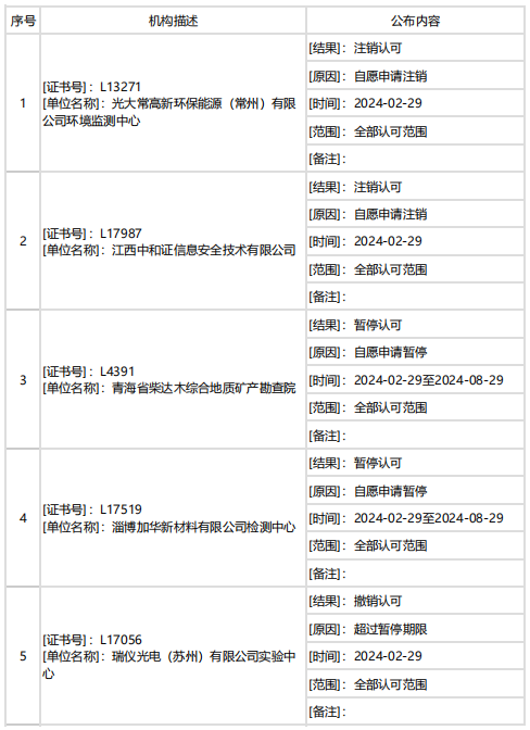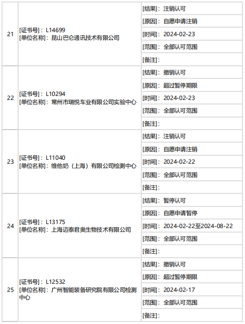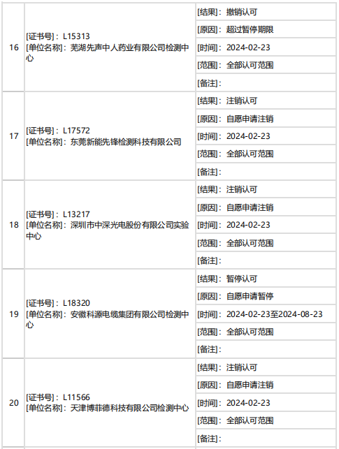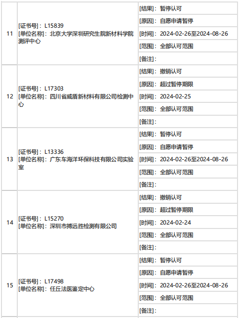 據中國合格評定國家認可委員會(CNAS)消息,2月下半月共計27家機構暫停/撤銷/注銷認可資質。7家機構因超過暫停期限被撤銷認可,其他機構為自愿申請暫停/注銷認可。