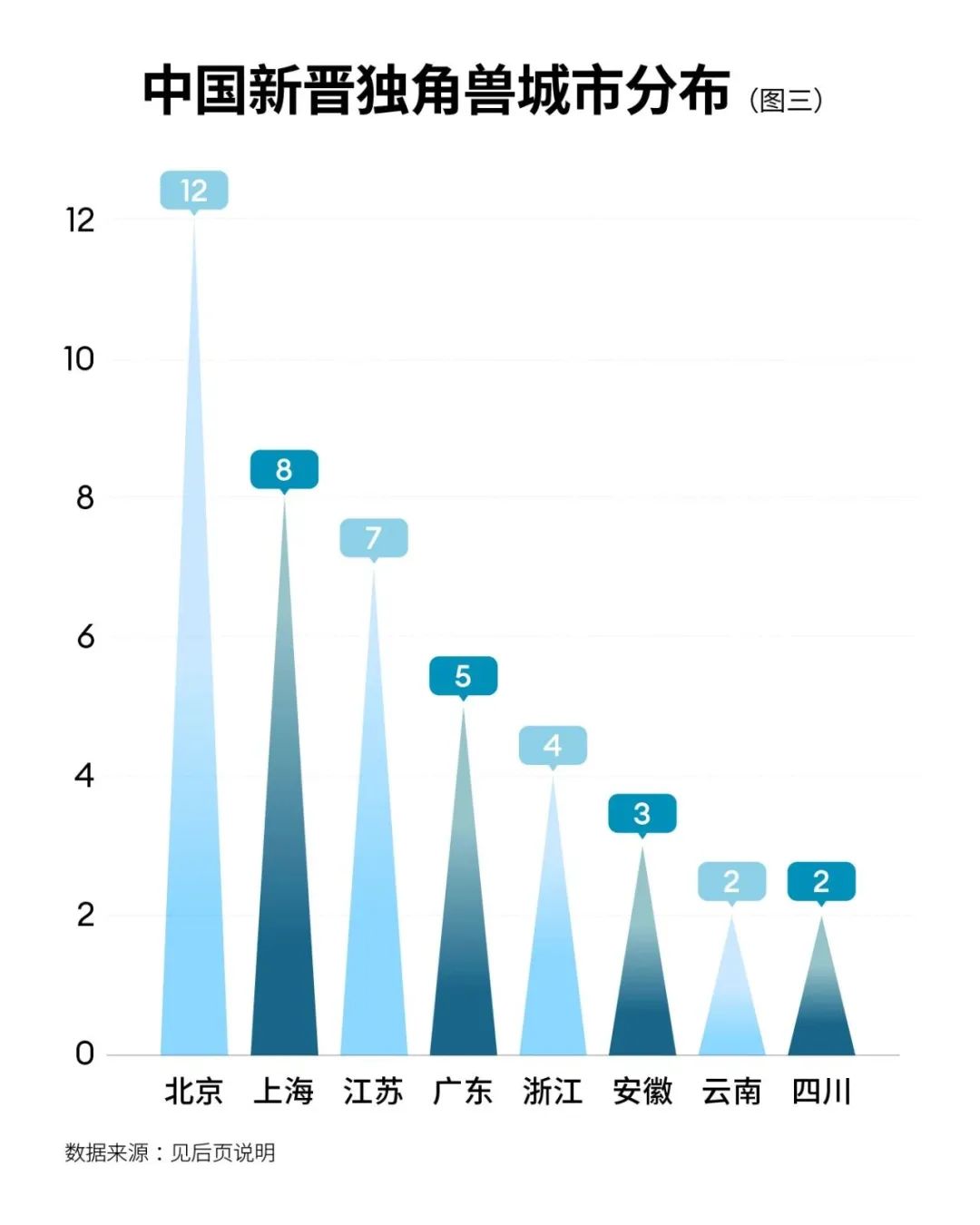 地區(qū)來看,2023年,北京創(chuàng)造了獨(dú)角獸總數(shù)的近三分之一,時隔一年反超上海、廣東重回第一。北京新增的獨(dú)角獸中近6成與人工智能技術(shù)密切相關(guān);上海則是機(jī)器人相關(guān)的獨(dú)角獸繼續(xù)發(fā)力,如智元機(jī)器人與達(dá)闥機(jī)器人等均在今年獲得巨額融資。