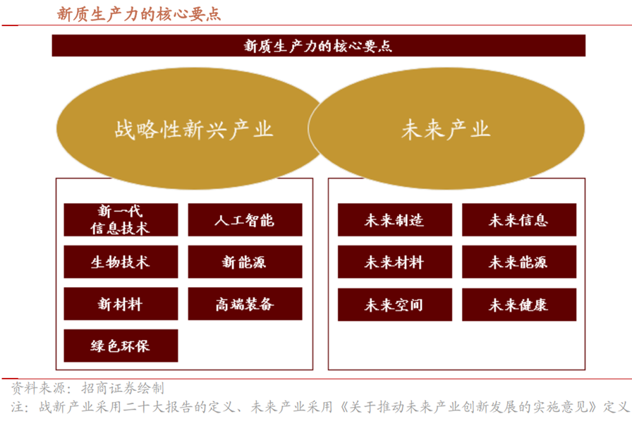 從行業屬性來看,一切利用新技術提升生產力水平的細分領域,都屬于新質生產力的應用范疇,既包括新一代信息技術、新能源、新材料、先進制造、生物技術等戰略性新興產業,也包括人工智能、量子信息、工業互聯網、衛星互聯網、機器人等未來產業。