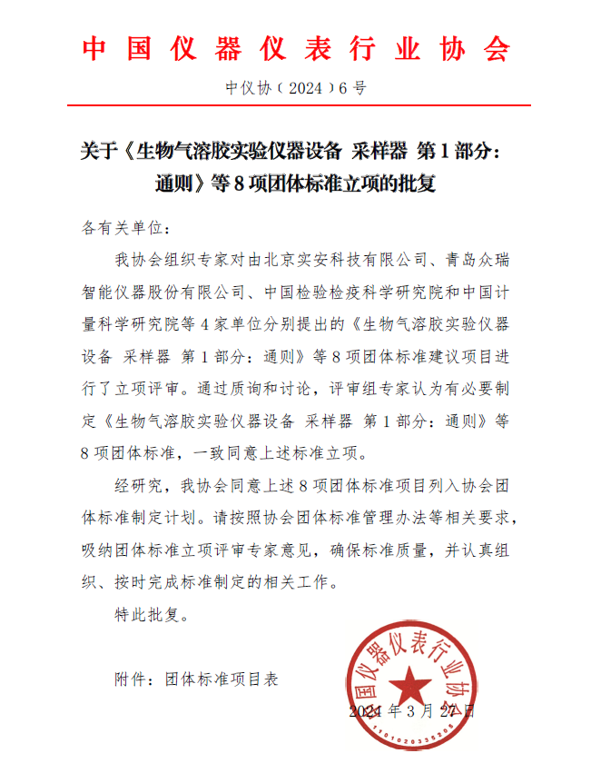 我協會組織專家對由北京實安科技有限公司、青島眾瑞智能儀器股份有限公司、中國檢驗檢疫科學研究院和中國計量科學研究院等4家單位分別提出的《生物氣溶膠實驗儀器設備 采樣器 第1部分:通則》等8項團體標準建議項目進行了立項評審。通過質詢和討論,評審組專家認為有必要制定《生物氣溶膠實驗儀器設備 采樣器 第1部分:通則》等8項團體標準,一致同意上述標準立項。