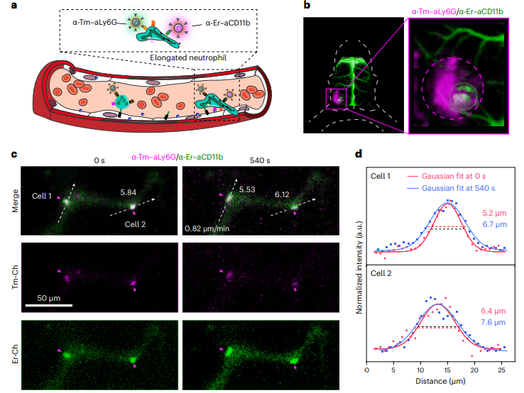 其中,團隊利用開發的新型近紅外二區稀土熒光探針特異性的標記了小鼠的中性粒細胞以研究炎癥血管中活化中性粒細胞的體內成像(圖2)。中性粒細胞能夠在血管內壁爬行到外滲部位,然后外滲是中性粒細胞活化的典型特征。CD11b是一種介導細胞粘附和遷移的中性粒細胞表面蛋白,在活化的中性粒細胞表面表達上調。中性粒細胞上Ly6GCD11b蛋白的雙重標記有助于在體內特異性地跟蹤活化的中性粒細胞。因此,在缺血性腦卒中小鼠模型中,靜脈注射抗ly6g抗體偶聯的α-TmNPs和抗cd11b抗體偶聯的α-ErNPs (α-Er-aCD11b),標記活化的中性粒細胞,雙標記的中性粒細胞表現出微弱的運動、滾動和爬行,表明它們在內皮細胞表面粘附牢固。此外,可以觀察到雙標記的中性粒細胞,沿著血流的剪切力被拉長,這通常被認為是中性粒細胞通過炎癥血管外滲的最后一步。