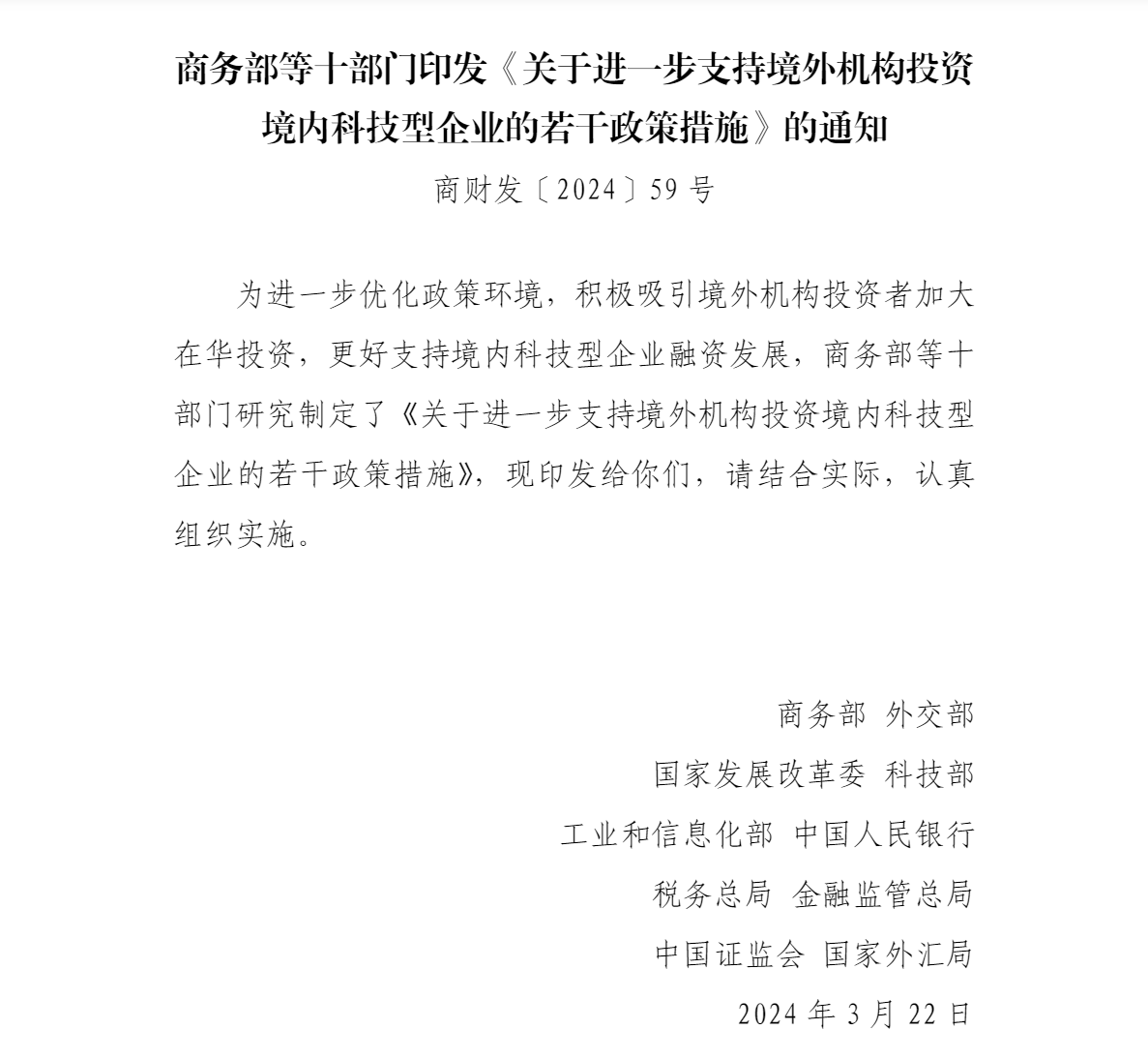 近日,商務(wù)部、外交部、國(guó)家發(fā)展改革委、科技部、工業(yè)和信息化部、中國(guó)人民銀行、稅務(wù)總局、金融監(jiān)管總局、中國(guó)證監(jiān)會(huì)、國(guó)家外匯局十部門聯(lián)合印發(fā)《關(guān)于進(jìn)一步支持境外機(jī)構(gòu)投資境內(nèi)科技型企業(yè)的若干政策措施》(以下簡(jiǎn)稱《若干措施》)。