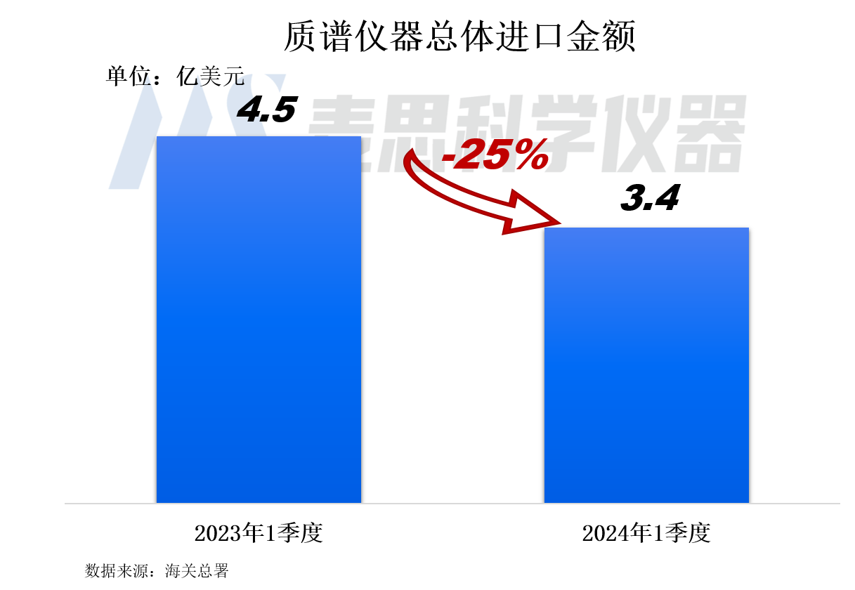 20241季度我國質譜儀器(含質譜聯用儀和其他質譜儀)進口金額為3.4億美元(約合人民幣24億元),同比下降25%,這是2021年以來同期進口額首次出現下滑。