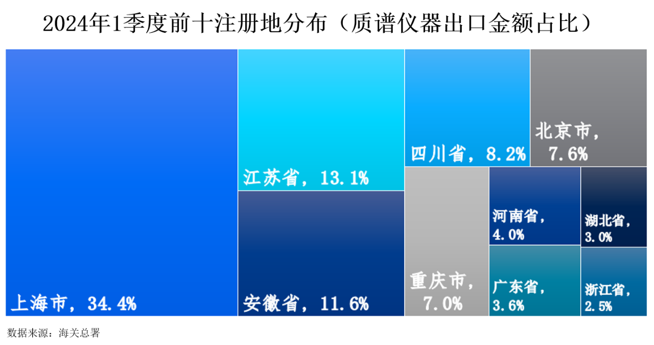 20241季度,中國質譜儀器出口額最高的十個注冊地依次是上海市、江蘇省、安徽省、四川省、北京市、重慶市、河南省、湖北省、廣東省和浙江省。其中,上海市以34.4%的占比遙遙領先,江蘇省和安徽省分別以13.1%11.6%的占比緊隨其后。四川省、北京市和重慶市的占比分別為8.2%7.6%7.0%