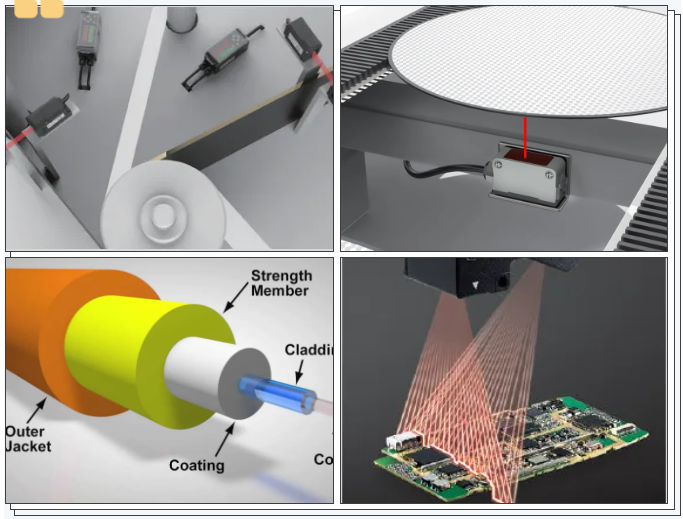 (左上)光伏行業(yè)卷繞糾偏 (左下)晶圓定位測量 (右上)光纖偏移測量 (右下)PCB質(zhì)量檢測