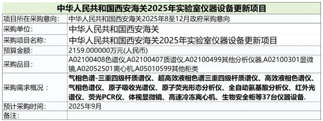 中華人民共和國西安海關2025年8至12月政府采購意向-中華人民共和國西安海關2025年實驗室儀器設備更新項目詳細情況