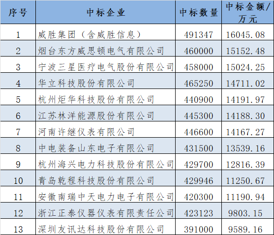 其中,本次招標電能表采集部分最終總中標金額為44.12億元,電能表分項中標企業共68家,相比2025年第一次招標減少4;用電信息采集分項中標企業54家,相比2025年第一次招標增加29家,主要受本次招標新增智能融合終端產品影響。本次中標金額前五名企業為威勝集團(含威勝信息)、煙臺東方威思頓電氣有限公司、寧波三星醫療電氣股份有限公司、華立科技股份有限公司、杭州炬華科技股份有限公司;本次招標計量互感器部分最終總中標金額為2.63億元,占2024年度總金額的17%。總共有40家企業實現中標。本次中標金額前三名企業為浙江天際互感器股份有限公司、河南許繼儀表有限公司、重慶華虹儀表有限公司。