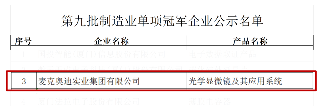 制造業(yè)單項(xiàng)冠軍企業(yè),是指長期專注于制造業(yè)特定細(xì)分領(lǐng)域,生產(chǎn)技術(shù)或工藝水平國際先進(jìn),單項(xiàng)產(chǎn)品(生產(chǎn)性服務(wù))市場占有率位居全球前列的企業(yè)。該獎(jiǎng)項(xiàng)是工信部為推動(dòng)制造業(yè)高質(zhì)量發(fā)展而開展的培育提升專項(xiàng)行動(dòng)的重要組成部分,代表了我國制造業(yè)向中高端邁進(jìn)的方向。此次麥克奧迪光學(xué)“顯微鏡及其應(yīng)用系統(tǒng)”產(chǎn)品的成功獲評,既是對我司在該領(lǐng)域的技術(shù)積淀、市場份額、品質(zhì)把控等方面的高度認(rèn)可,更是對“創(chuàng)新智造,引領(lǐng)顯微科技”理念的最佳詮釋。