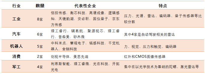 工業(yè)領(lǐng)域的項(xiàng)目仍然比較分散,壓力、光譜、雷達(dá)等產(chǎn)品都有涉及;汽車領(lǐng)域應(yīng)用比較集中,大部分集中在與自動(dòng)駕駛相關(guān)的傳感器上;機(jī)器人不再像以前的六維力和觸覺那樣集中,投資人開始關(guān)注不同的傳感器類型了。