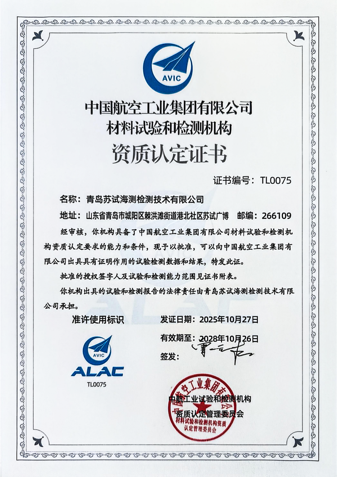 近日,蘇試試驗(yàn)青島實(shí)驗(yàn)室正式獲得中國航空工業(yè)材料試驗(yàn)和檢測機(jī)構(gòu)資質(zhì)認(rèn)定(ALAC)證書,標(biāo)志著其在金屬材料力學(xué)性能檢測領(lǐng)域的技術(shù)能力與管理水平,已符合航空工業(yè)高標(biāo)準(zhǔn)要求。