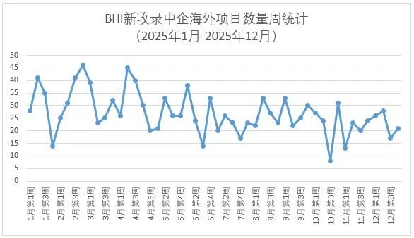 據(jù)BHI中企海外項(xiàng)目數(shù)據(jù)庫監(jiān)測,上周(12月22日-26日)BHI新收錄中企新簽約/中標(biāo)/公告海外項(xiàng)目21個(gè),較此前小幅回升。其中中國交建7個(gè)項(xiàng)目、中國能建6個(gè)項(xiàng)目。2025年新收錄項(xiàng)目超過1340個(gè)。近一年每周新收錄項(xiàng)目數(shù)量趨勢統(tǒng)計(jì)詳見下圖。