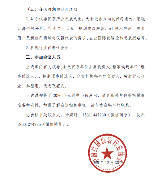 根據(jù)《中國儀器儀表行業(yè)協(xié)會章程》規(guī)定,經(jīng)中國儀器儀表行業(yè)協(xié)會(以下簡稱協(xié)會)換屆工作領(lǐng)導(dǎo)小組研究決定,定于2026 年3月8-10 日召開協(xié)會第九屆會員代表大會。現(xiàn)將會議有關(guān)事項預(yù)通知如下: