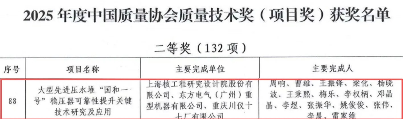 重慶川儀十七廠有限公司(以下簡稱“川儀十七廠”)與上海核工程研究設計院股份有限公司、東方電氣(廣州)重型機器有限公司聯合攻關的“大型先進壓水堆‘國和一號’穩壓器可靠性提升關鍵技術研究及應用”項目,榮獲2025年中國質量協會“質量技術獎”二等獎。