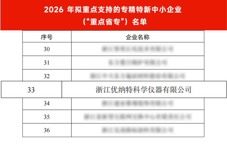 近日,浙江省經(jīng)濟和信息化廳公示了2026年擬重點支持的專精特新中小企業(yè)(“重點省專”)名單。400家企業(yè)實施融通入鏈“四提一強”推進計劃。浙江優(yōu)納特科學(xué)儀器有限公司憑借雄厚的技術(shù)創(chuàng)新能力和市場影響力,成功入選。