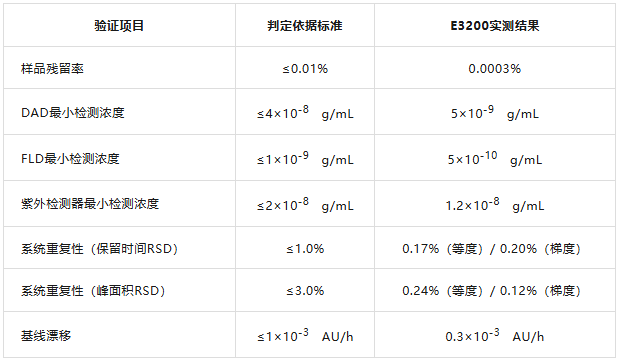 從數據可見,E3200 HPLC在各項關鍵指標上均優于標準要求,尤其在最小檢測濃度、殘留率等核心性能上表現突出。