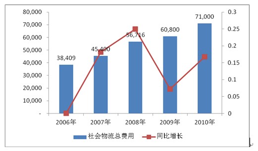 2006-2010年我國社會物流總費用由38409.48億元增長到71000.00億元,年復(fù)合增長率16.60%,物流業(yè)在我國經(jīng)濟的發(fā)展中扮演起越來越重要的角色。