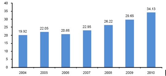 “十一五”期間我國物流基礎(chǔ)設(shè)施的不斷建設(shè)和完善,物流業(yè)取得了快速的發(fā)展。2004年我國物流業(yè)固定資產(chǎn)投資總額為0.67萬億元,到2010年投資規(guī)模已經(jīng)達到3萬億元,年復(fù)合增長率達到28%;2004年我國社會物流總額為40萬億,到2010年已經(jīng)達到125萬億元,年復(fù)合增長21.74%。