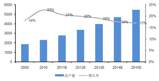 傳感器是安防設(shè)備的核心器件,未來傳感器在安防領(lǐng)域的市場規(guī)模增速將和安防行業(yè)的產(chǎn)值增速同步,預(yù)計未來5 年年均增長在20%左右。根據(jù)我國安防行業(yè)“十二五”發(fā)展規(guī)劃(審議稿),到“十二五”末期實現(xiàn)產(chǎn)業(yè)規(guī)模翻一番的總體目標,年均增長率達到20%左右,2015 年總產(chǎn)值達到5000 億元;而在2010 年,我國安防行業(yè)總產(chǎn)值達到2,300 億元,年增長率23%。