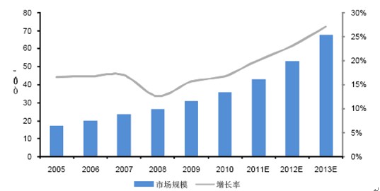 根據(jù)賽迪顧問《2009-2010 年中國社區(qū)安防電子市場研究》預(yù)測,2013年我國社區(qū)安防電子市場規(guī)模將達到517億元,相比2009年統(tǒng)計的313億元,4年復(fù)合增速為13.4%。